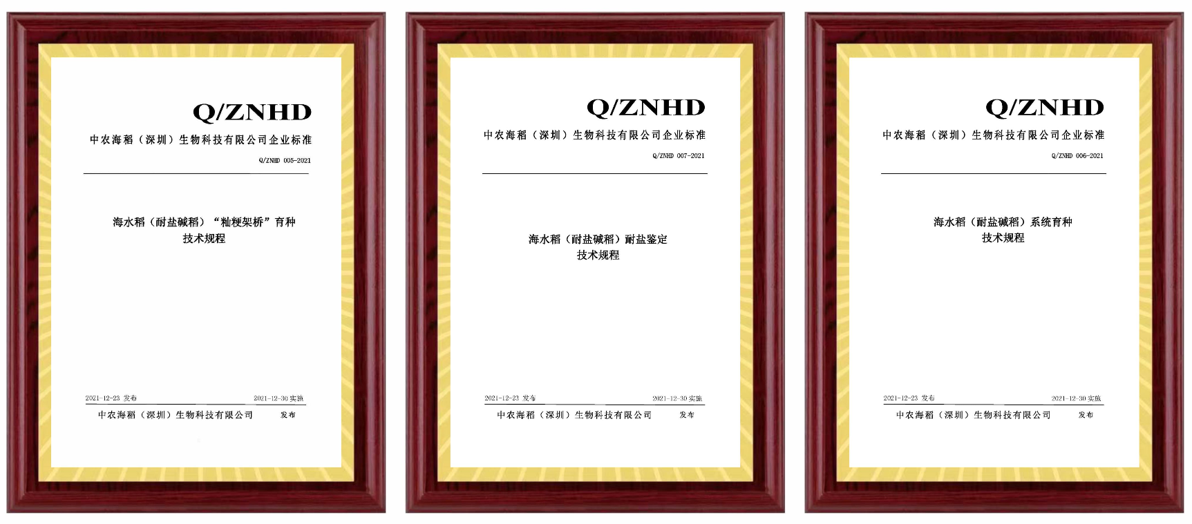 2021年12月23日,由中農(nóng)海稻(深圳)生物科技有限公司起草的海水稻(耐鹽堿稻)“秈粳架橋”育種技術(shù)規(guī)程(Q/ZNHD 005-2021)、海水稻(耐鹽堿稻)育種技術(shù)規(guī)程(Q/ZNHD 006-2021)、海水稻(耐鹽堿稻)耐鹽鑒定技術(shù)規(guī)程(Q/ZNHD 007-2021)三個(gè)企業(yè)標(biāo)準(zhǔn)正式發(fā)布。